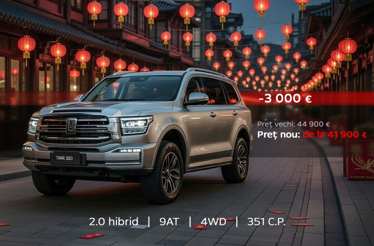 TANK 300 — un SUV robust cu motor pe benzină de 2,0 litri și 220 CP, cutie de viteze automată cu 8 trepte și sistem de tracțiune integrală 4WD.